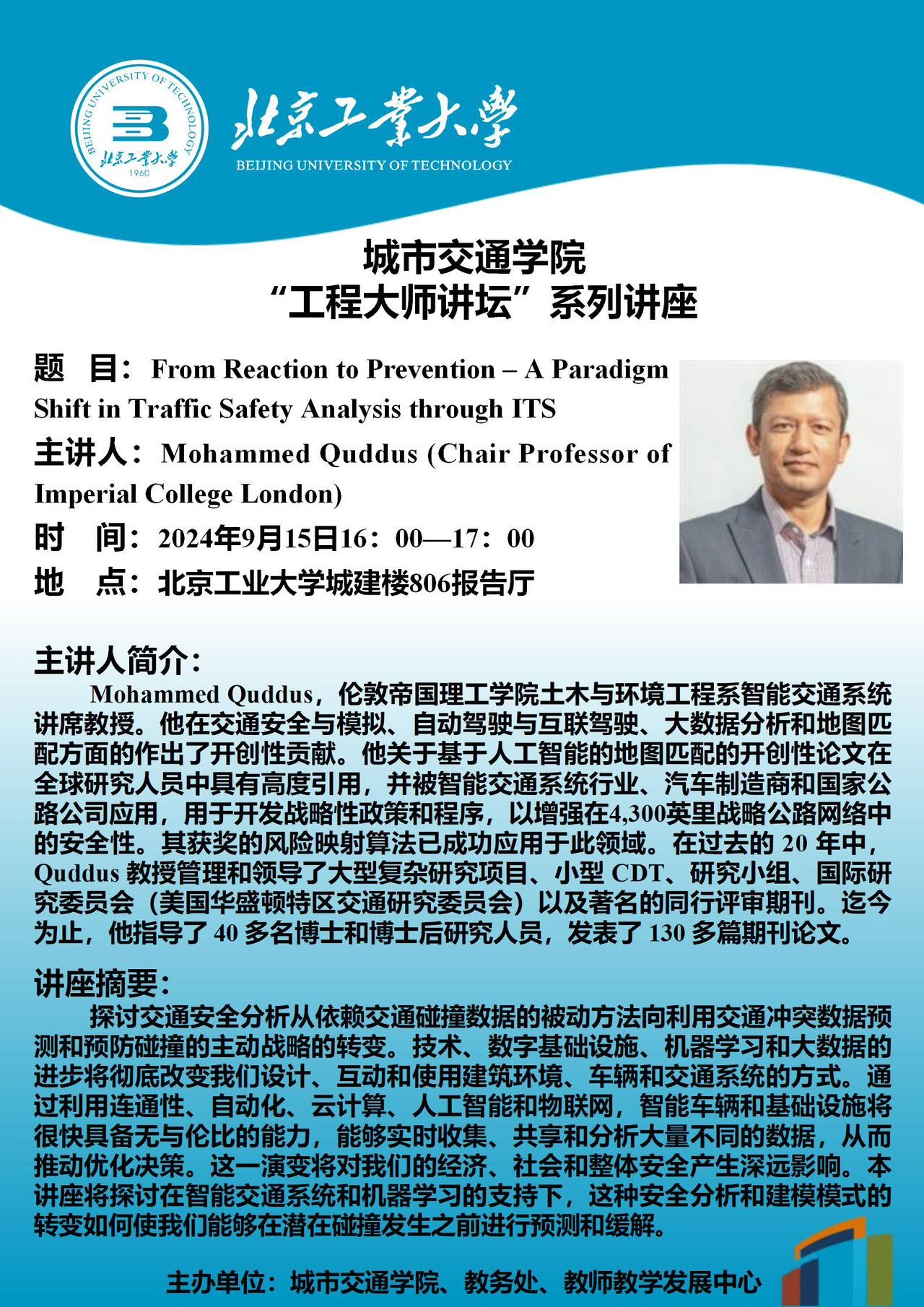 【交通 | 学术报告】w88win体育官网入口"工程大师讲坛"系列讲座— From Reaction to Prevention – A Paradigm Shift in Traffic Safety Analysis through ITS