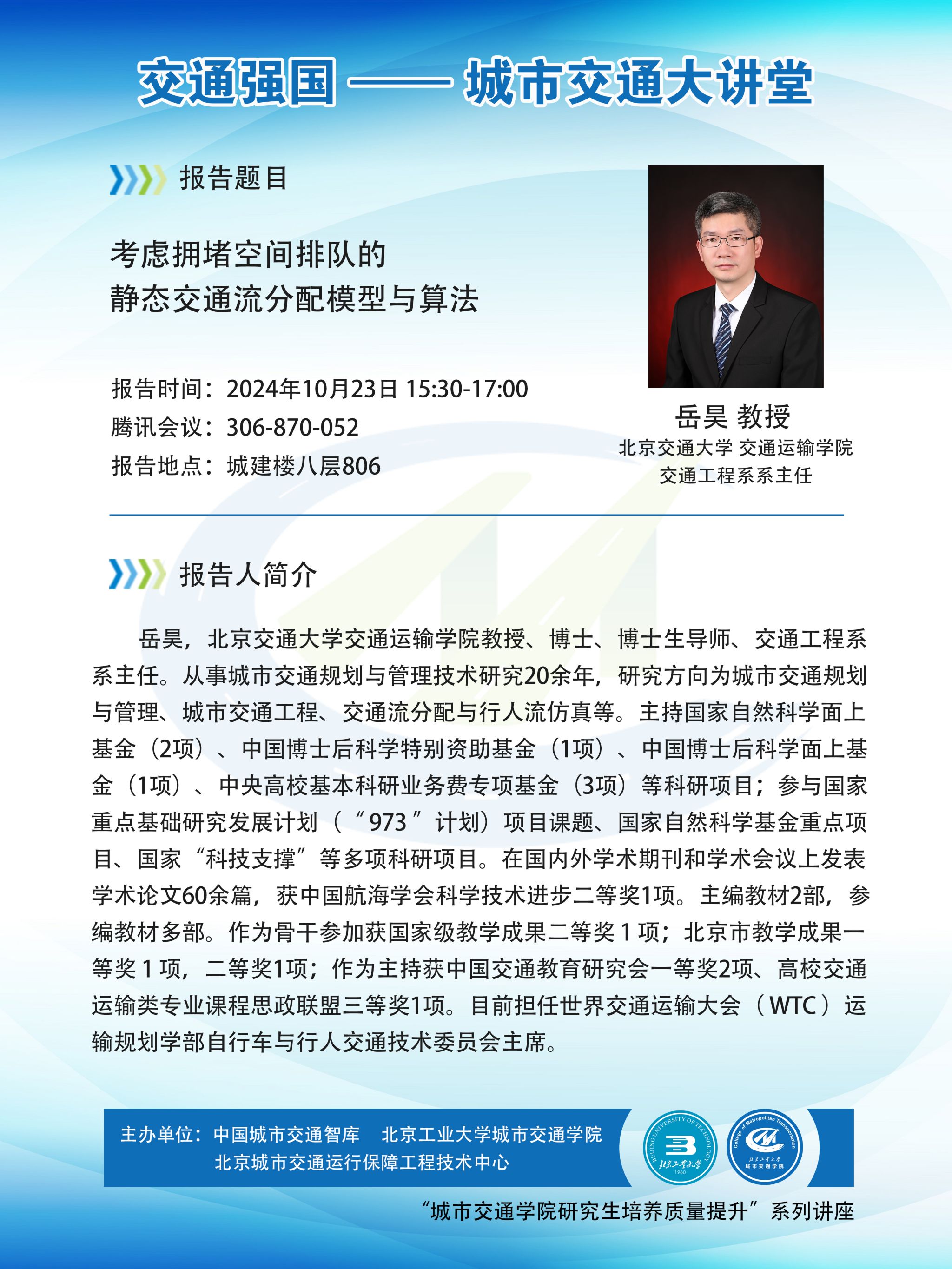 【交通 | 学术报告】 交通强国·城市交通大讲堂——考虑拥堵空间排队的静态交通流分配模型与算法