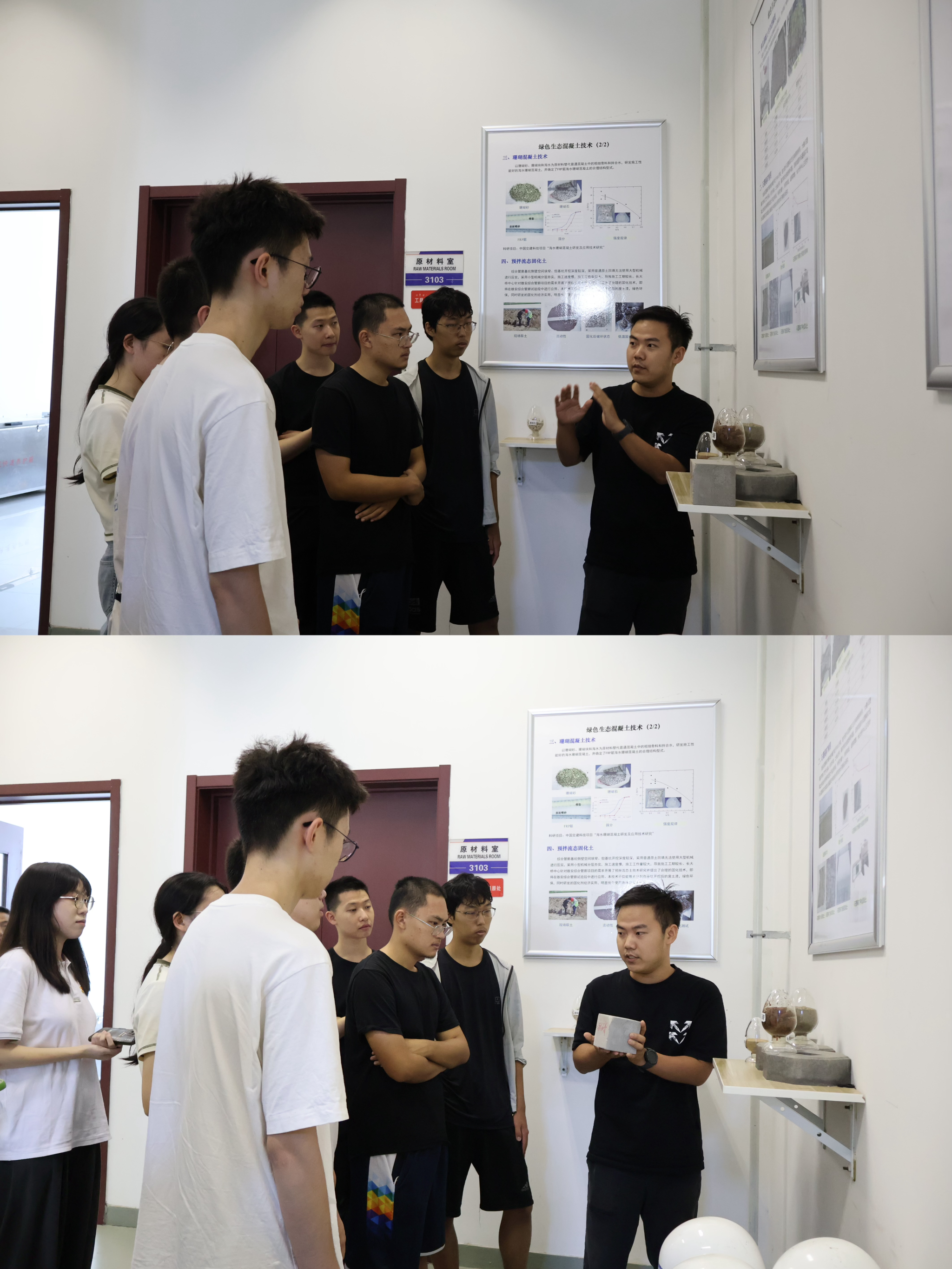 随后,师生们走进岩土实验室,这里展示了铺筑在我国各地大桥或道路上的基础材料。这些材料各有其独特的优势,为人们的交通出行提供了坚实的基础。在这次实践活动中,我们的队员以极大的热情和专注度,亲手触摸并感受了各种工程材料样品。他们将这些材料的物理特性与在课堂上学到的路基和路面知识相结合,实现了理论与实践的有机融合。通过与项目负责人的深入讨论和交流,队员们不仅对材料的性能和特点有了更深刻的理解,也进一步探讨了这些材料在实际工程中的应用潜力。在炎炎夏日中,前辈们依旧在实验室中辛勤工作,他们的“工匠精神”深深打动了每一位参观的师生,激励着大家不断前行。这次交流不仅增进了他们对专业知识的理解,也为未来的学术和职业生涯打下了坚实的基础。