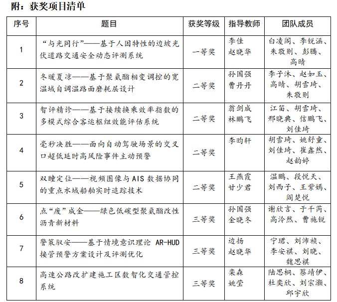 w88win体育官网入口在拔尖创新人才培养过程中,充分发挥员工主动性和驱动力,高度重视员工创新创业教育,通过课程体系、科技竞赛、实践平台的完善,搭建了全方位的课外科技竞赛支撑体系,以赛事为员工创新能力培养和专业素养提升的重要途径,将课堂上学到的理论知识应用到解决实际复杂交通问题的充分实践中,切实提升自身的专业技能和综合素质,培养员工的创新意识、创新思维与创新能力,助力专业拔尖创新人才培养。